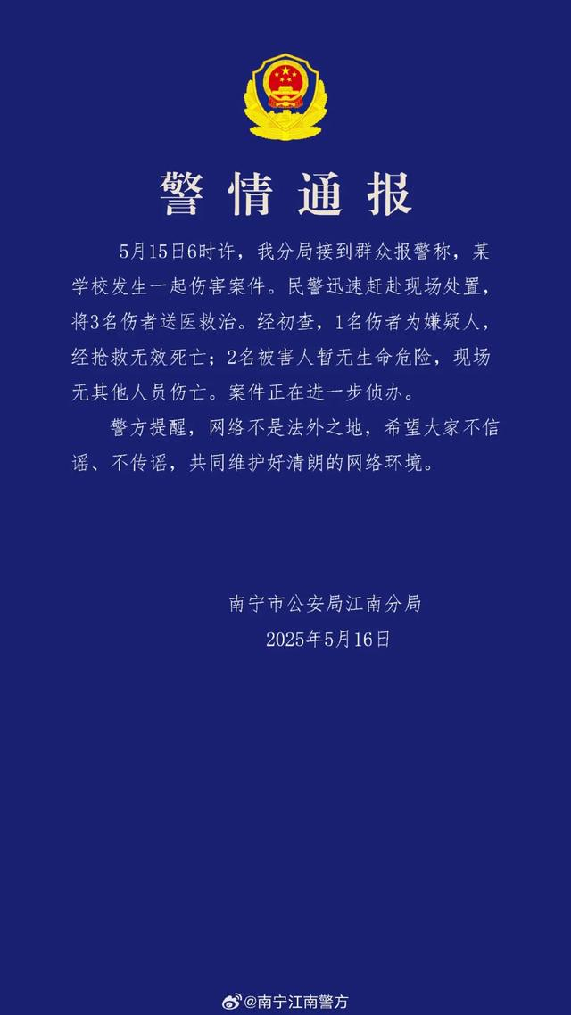 5月16日晚,广西南宁市公安局江南分局通报:5月15日6时许,南宁某学校发生一起伤害案件。民警迅速赶赴现场处置,将3名伤者送医治疗。经初查,1名伤者为嫌疑人,经抢救无效死亡;2名被害人暂无生命危险,现场无其他人员伤亡。案件正在进一步侦办。