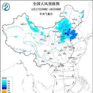 受气旋和冷空气影响,17日,西北地区东部、内蒙古大部、华北地区、东北地区、黄淮北部等地有大风天气过程。中央气象台5月17日06时继续发布大风蓝色预警。预计,5月17日08时至18日08时,内蒙古中东部、河北大部、北京、天津、辽宁中西部、山东、河南北部、安徽北部、甘肃河西、新疆东部等地有5~6级风、阵风7~8级,其中,河北北部、辽宁西部、天津东部等地局地有7~8级风、阵风9~10级;渤海、渤海海峡、黄海北部和中部海域将有7~8级风、阵风9~10级(见图1)。