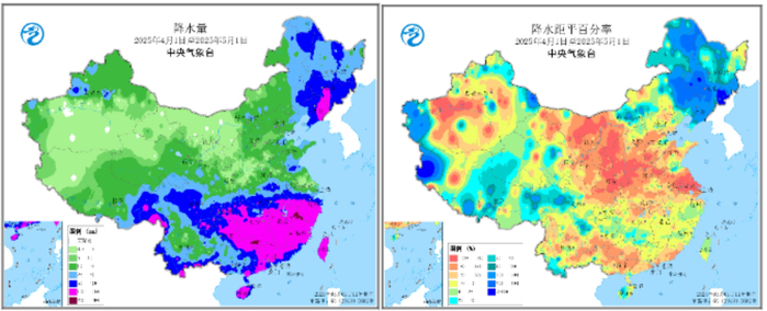 图2全国降水量及降水距平百分率图(2025年4月1日至4月30日)