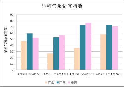 截至4月末,江南早稻处于三叶至移栽返青期;华南大部处于分蘖期,海南早稻处于抽穗至乳熟期;大部发育期接近常年或偏早。