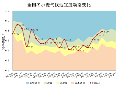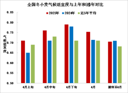 播种以来,全国冬小麦平均气候适宜度为0.71,为适宜等级,与上年同期持平,比近5年平均高0.03。其中,4月平均气候适宜度为0.75,较上年同期和近5年平均高0.04,适宜度等级为适宜,上中下旬均为适宜(图8)。