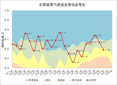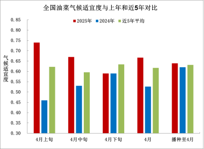 播种以来,全国油菜平均气候适宜度为0.64,为适宜等级,比上年同期高0.02,比近5年平均高0.01。其中,4月全国油菜平均气候适宜度为0.67,分别较上年同期和近5年平均高0.14和0.05,适宜度等级为适宜,其上旬为非常适宜、中下旬为适宜(图9)。
