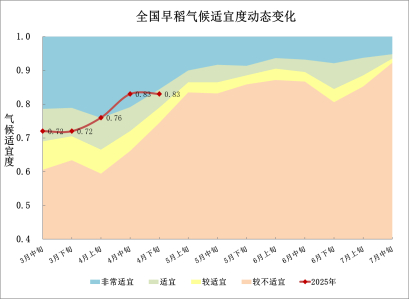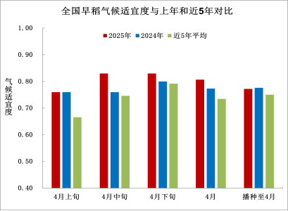 播种以来,全国早稻平均气候适宜度为0.77,为非常适宜,比上年同期低0.01,比近5年平均高0.02。其中,4月全国早稻平均气候适宜度为0.79,比上年同期高0.03,较近5年平均高0.06,适宜度等级为非常适宜,其中上旬为适宜,中下旬为非常适宜(图10)。