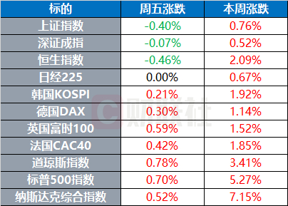 美股周五收高,标普500指数涨0.7%,为连续第五个交易日上涨,道指涨0.78%,纳指涨0.52%。本周美股三大股指均录得涨幅,道指累计上涨3.41%,标普500指数上涨5.27%,纳指涨幅达7.15%。