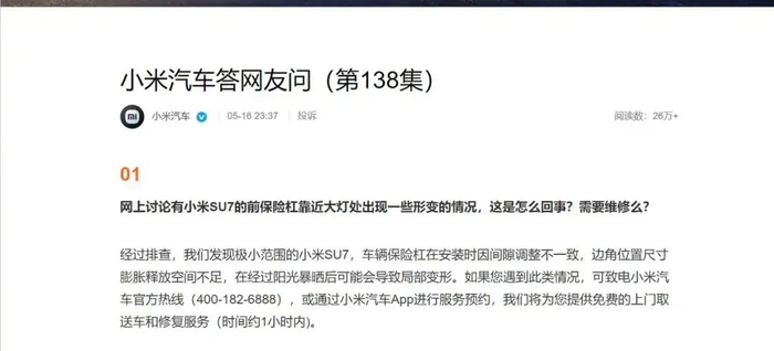 小米汽车称:经过排查,我们发现极小范围的小米SU7,车辆保险杠在安装时因间隙调整不一致,边角位置尺寸膨胀释放空间不足,在经过阳光暴晒后可能会导致局部变形。如果您遇到此类情况,可致电小米汽车官方热线(400-182-6888),或通过小米汽车App进行服务预约,我们将为您提供免费的上门取送车和修复服务(时间约1小时内)。