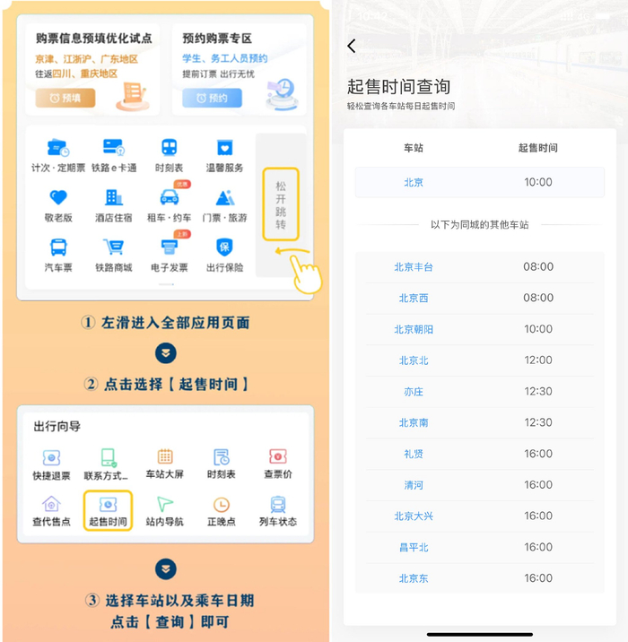 如需查询其他城市火车站起售时间,打开铁路12306 App,左滑进入全部应用界面,点击选择“起售时间”,选择车站级乘车日期,点击“查询”即可。