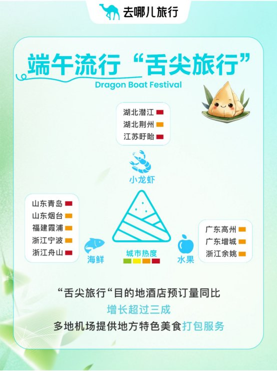 去哪儿报告还提到,“追逐时令美食”成为出行新动力。数据显示,前往潜江、荆州、青岛、宁波、舟山等城市的火车票预约量同比增长明显,酒店预订量同比增长超过三成,且仍在持续增长。