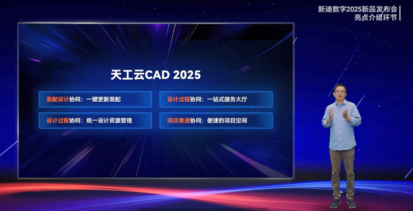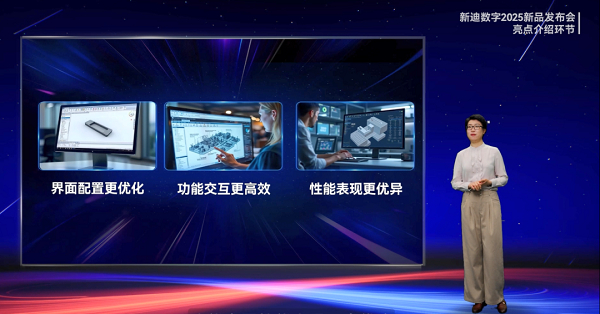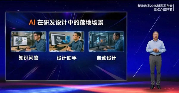 随后,新迪数字首席技术官陈志杨博士及公司核心产研团队的负责人分别从更加智能、更加易用、更多协同、更多场景四个维度,对新产品的亮点进行了系统解读,全面展示了新版本在AI赋能、设计效率、用户体验、协同能力和行业应用场景等方面的升级和扩展。