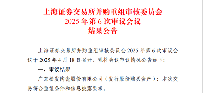 4月18日,上交所并购重组委员会召开2025年第6次审议会议,审议结果为*ST松发发行股份购买资产事项,符合重组条件和信息披露要求。