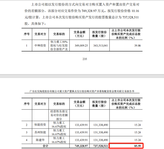 以发行股份价格10.16元/股计算,*ST松发购买资产发行的股份数量总计约为7.38亿股,占发行股份购买资产完成后总股本的85.59%。