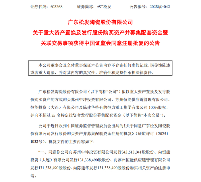 同时,*ST松发拟发行股份募集配套资金不超过40亿元的注册申请,获得中国证监会批复同意。