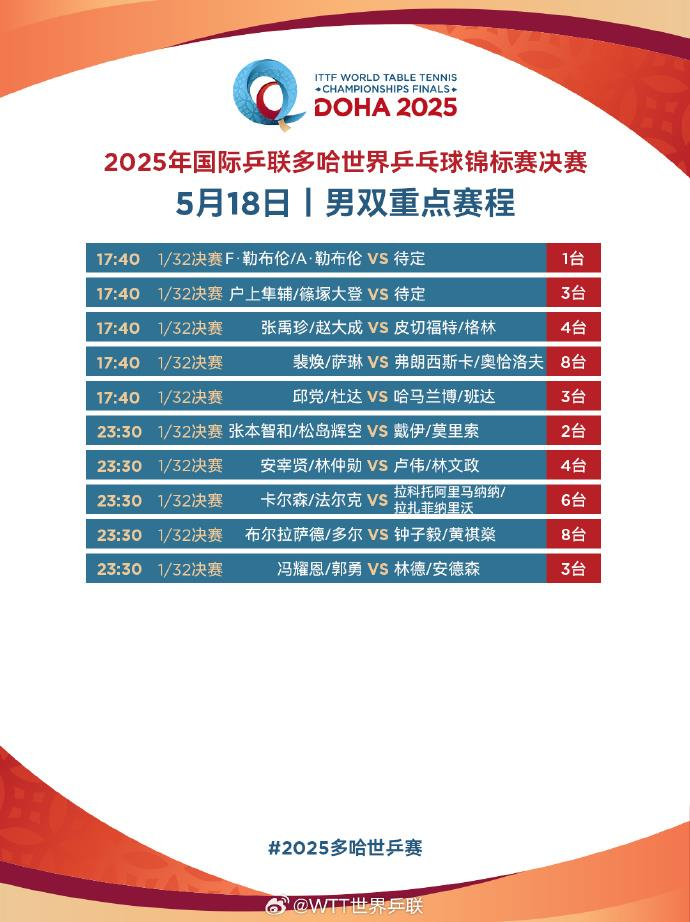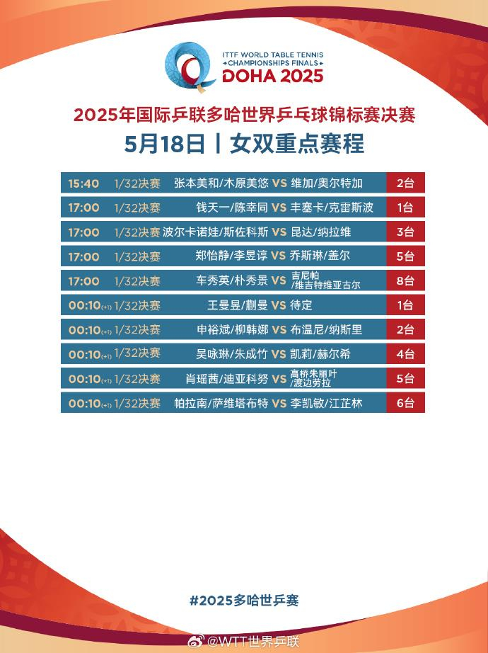 北京时间今天下午多哈世乒赛将火热开打!