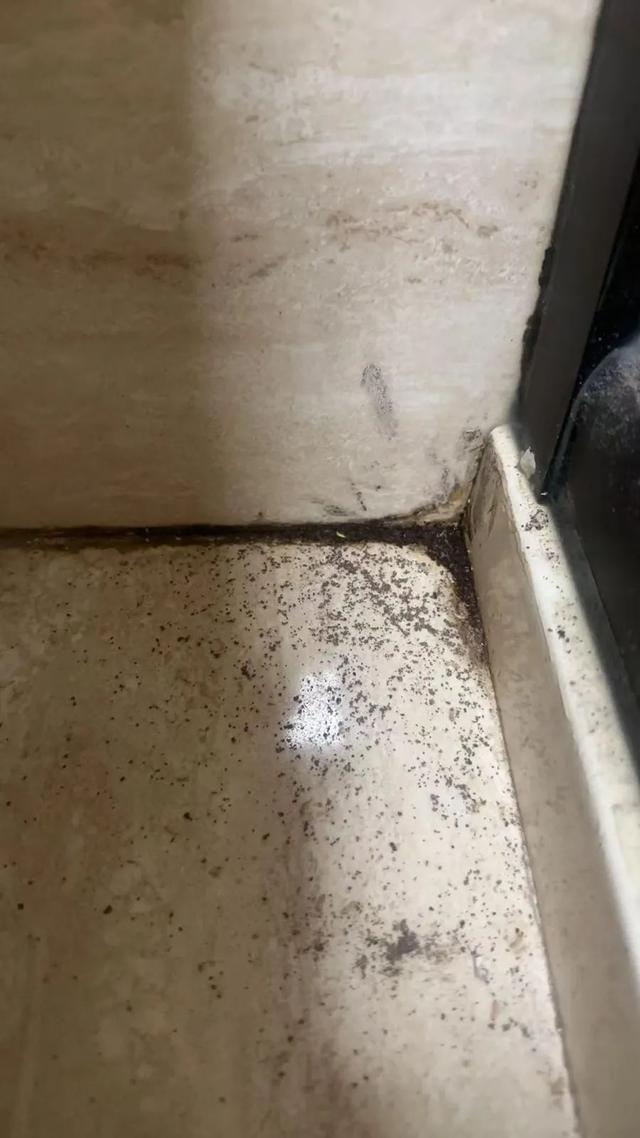 该户主人去卫生间时,发现原本干干净净的卫生间内,突然变得很“脏”。在淋浴房挡水条、墙面与地面衔接的角落处,均出现了黑黑的“污垢”,并呈现角落处的污垢厚黑,连接成线,而周边则像洒了一些“泥灰”,呈木屑般的颗粒状。