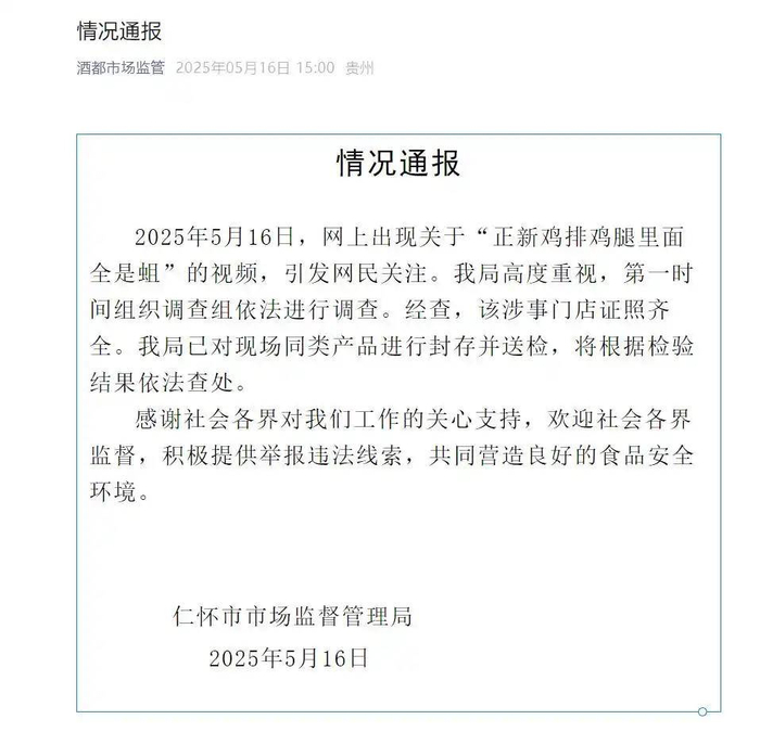 贵州仁怀市市场监督管理局16日发布情况通报:网上出现关于“正新鸡排鸡腿里面全是蛆”的视频,引发网民关注。我局高度重视,第一时间组织调查组依法进行调查。经查,该涉事门店证照齐全。我局已对现场同类产品进行封存并送检,将根据检验结果依法查处。感谢社会各界对我们工作的关心支持,欢迎社会各界监督,积极提供举报违法线索,共同营造良好的食品安全环境。