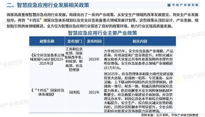 国家高度重视智慧应急应用行业发展,陆续出台了一系列产业政策。从安全生产领域的改革发展意见,到安全产业发展指导,再到“十四五”国家应急体系规划以及安全应急装备重点领域发展计划等。