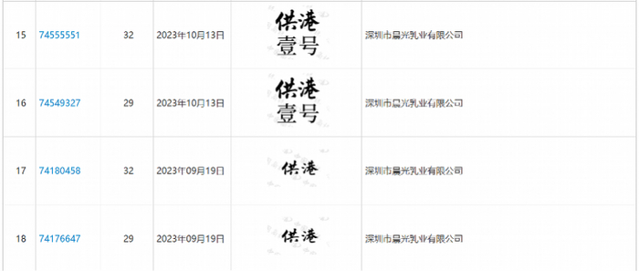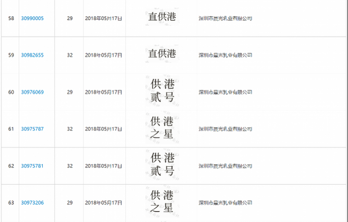 国家知识产权局商标局中国商标网信息显示,晨光乳业从2014年开始申请“供港”相关商标,包括“供港”“供港壹号”“直供港”“供港贰号”“供港之星等,据记者不完全统计,晨光乳业申请的“供港”商标记录达33条,直到2023年该公司仍在尝试申请供港相关商标。