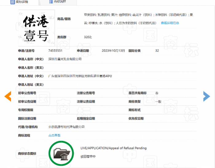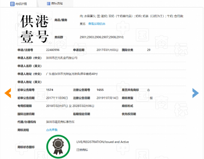 但其中多数商标的状态显示为申请被驳回、不予受理或驳回审查中,仅2017年申请的“供港壹号”商标状态显示为“注册商标”,商品及服务涉及肉; 水果罐头; 蛋; 酸奶; 豆奶(牛奶替代品); 奶粉; 奶茶(以奶为主); 牛奶; 食用油; 果冻。该商标专用期限为2018年02月07日至 2028年02月06日。