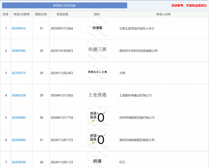 但实际上,很多企业为了蹭上“供港”热度,会在商标上做文章。记者在国家知识产权局商标局中国商标网上搜索“供港”商标,共检索到123件商标,包括“供港菜”“供港生鲜”“供港鲜活”“供港猪场”等,但其中多数商标申请均被驳回。