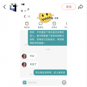 这条名为《这说的是人话吗?太离谱了!》的网帖显示,当事人陈女士看到深圳市欣X财务管理有限公司在招聘文员岗位,月薪为2000-3000元,位于深圳市龙岗区,于是在Boss直聘上向对方了解具体情况:“您好,不知道这个岗位是否还在招人,我仔细查看了您发布的职位信息,觉得自己比较适合,希望能得到您的回复。”没想到的是,对方随后回复,“不行,太丑了。”陈女士感觉非常无语和气愤。
