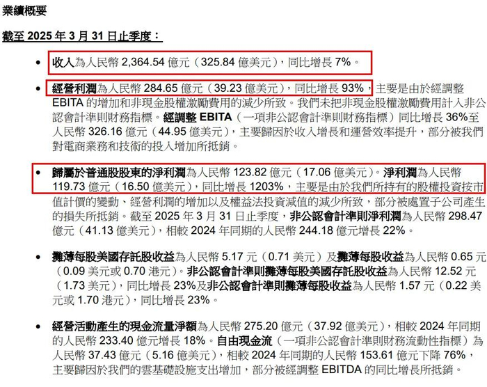 根据财报,截至2025年3月31日止季度,收入为人民币2364.54亿元(325.84亿美元),同比增长7%。经营利润为人民币284.65亿元(39.23亿美元),同比增长93%;归属于普通股股东的净利润为人民币123.82亿元(17.06亿美元);净利润为人民币119.73亿元(16.50亿美元),同比增长1203%。
