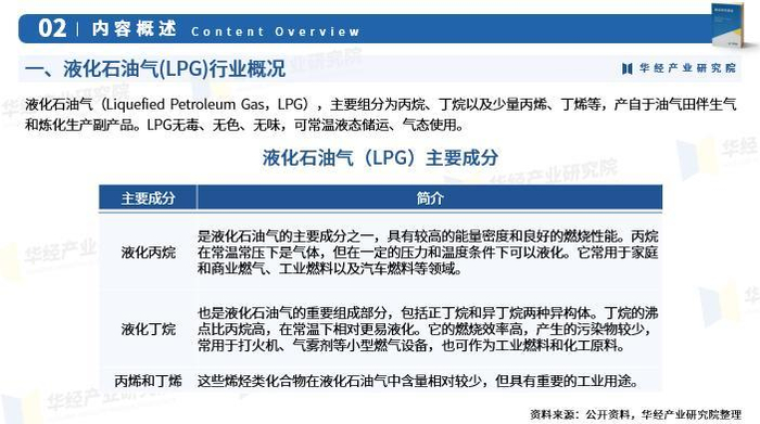 液化石油气,主要组分为丙烷、丁烷以及少量丙烯、丁烯等,产自于油气田伴生气和炼化生产副产品。LPG无毒、无色、无味,可常温液态储运、气态使用。