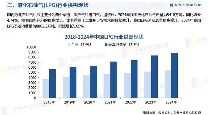 国内液化石油气供应主要分为两个渠道:国产气和进口气。据统计,2024年我国液化石油气产量为5418万吨,同比增长4.74%,随着国内经济的稳步增长,尤其得益于工业用LPG需求的持续攀升,我国LPG消费总量稳步提升,2024年我国LPG表观消费量为8863.3万吨,同比增长5.69%。