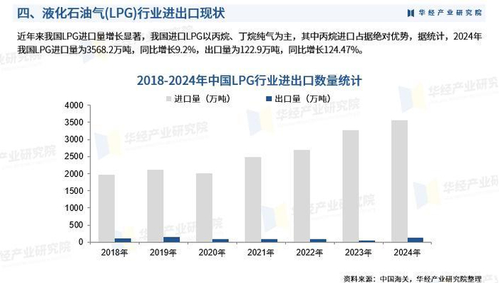 近年来我国LPG进口量增长显著,我国进口LPG以丙烷、丁烷纯气为主,其中丙烷进口占据绝对优势,据统计,2024年我国LPG进口量为3568.2万吨,同比增长9.2%,出口量为122.9万吨,同比增长124.47%。