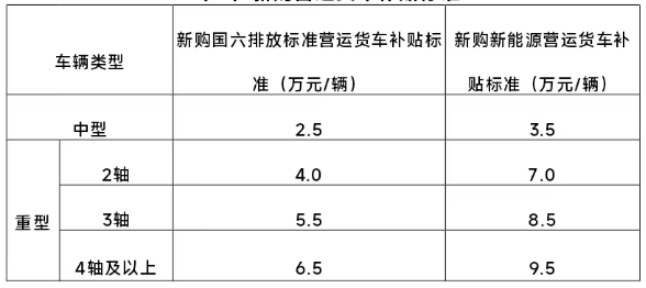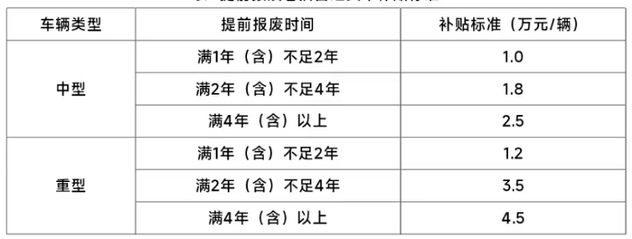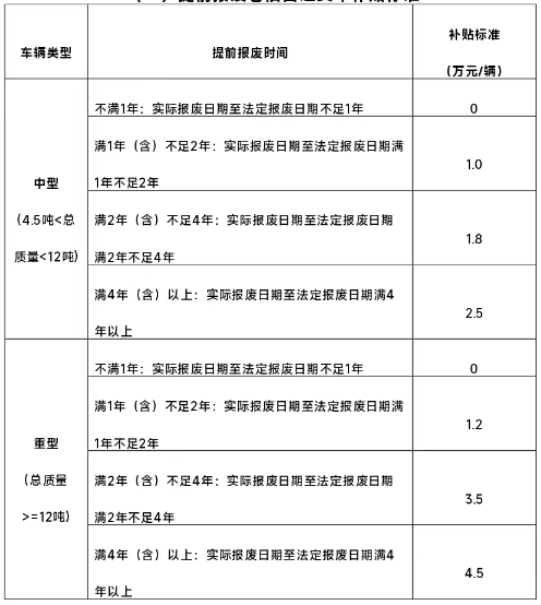 报废补贴:按车辆类型(中型/重型)及提前报废年限分档补贴(最高4.5万元/辆);