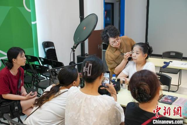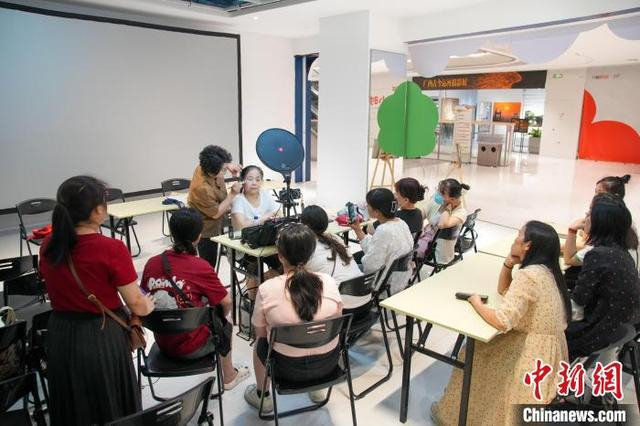 5月17日晚,广西南宁,民众在一处商场内开设的青年夜校体验美妆课程。由共青团南宁市兴宁区委员会携手南宁升喜朝阳里购物中心打造的南宁市青年夜校兴宁区朝阳里分校当日揭牌。该夜校将免费提供职业技能提升、文化艺术修养、创新创业指导等丰富课程,成为民众家门口的“充电站”。中新社记者 陈冠言 摄