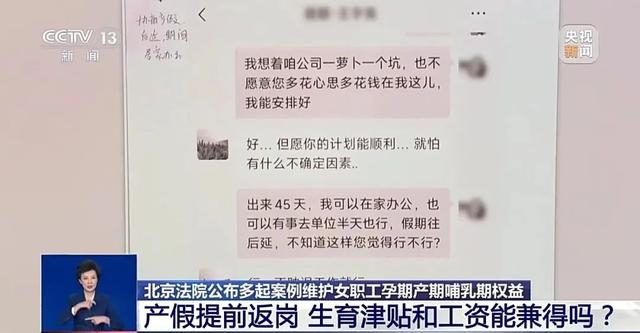 刘女士在怀孕生产前一个月左右时,与公司法定代表人王某就产假事宜进行微信沟通:“生产45天后,我可以在家办公,有事去单位半天也行,假期往后延,不知道这样您觉得行不行?”