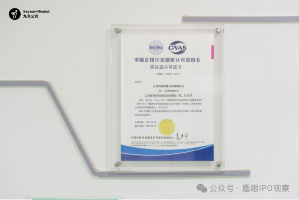 在产品检测环节,九号电动工厂的“九号科技检测中心”和纳恩博(常州)科技有限公司的可靠性实验室,先后获得“中国合格评定国家认可委员会”的CNAS许可证书。九号公司也是我国短交通企业中,唯一同时拥有两个CNAS认证实验室的企业。“我们实验室拥有行业内领先的检测仪器160余套,可以对公司产品的每一个环节进行精心的检测和评估。我们出具的检测数据结果,被全球100多个国家和地区的国际互认机构予以承认。”纳恩博常州可靠性实验室相关负责人说道。
