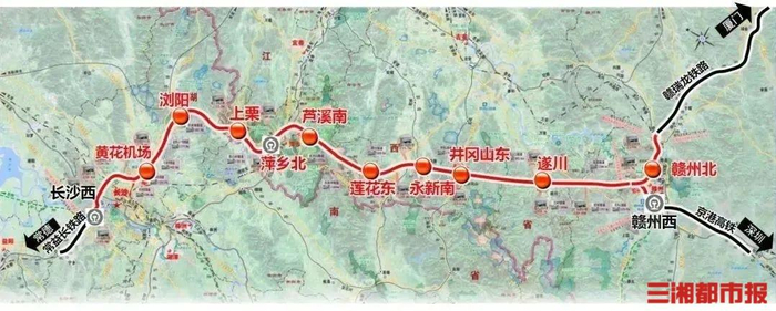 长赣高铁线路自常益长高铁长沙西站引出,向东南经长沙黄花机场、浏阳,江西省上栗、萍乡、莲花、永新、井冈山、遂川至赣州北站,正线长约429.4公里,设计时速350公里,设站11座,预计工期5年。