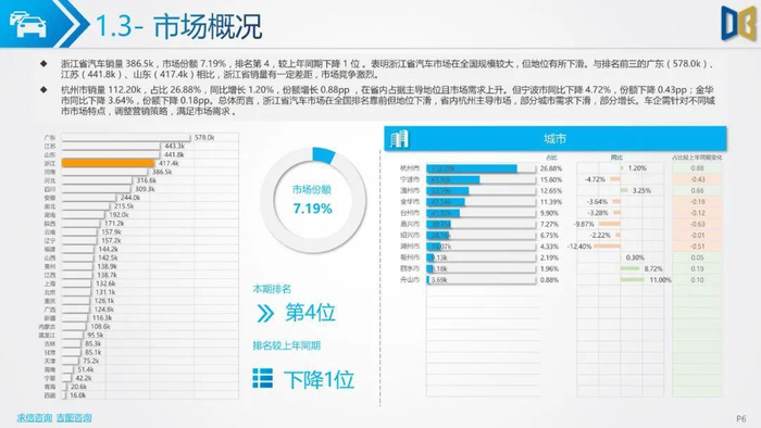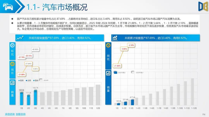 整体市场方面,浙江省汽车市场以国产汽车为主,占比87.69%,进口车和商用车分别占3.40%和8.92%。2025年初市场较2024年同期有所下滑,但降幅逐渐收窄,市场需求逐步恢复。轿车和SUV销量占比较大,但需求有所收缩;MPV和交叉型车需求上升。新能源车型市场份额逐步扩大,尤其是纯电动和混动车型。