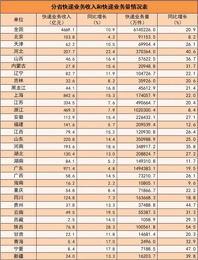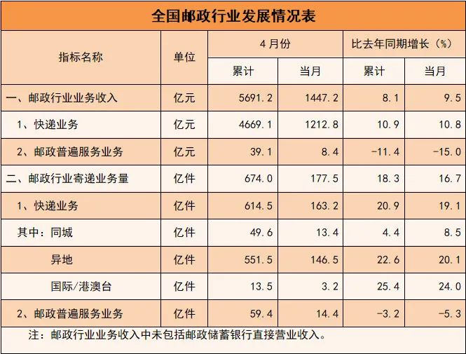 4月份,邮政行业业务收入(不包括邮政储蓄银行直接营业收入)完成1447.2亿元,同比增长9.5%。其中,快递业务收入完成1212.8亿元,同比增长10.8%。