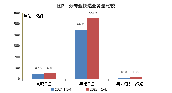 1—4月,同城快递业务量累计完成49.6亿件,同比增长4.4%;异地快递业务量累计完成551.5亿件,同比增长22.6%;国际/港澳台快递业务量累计完成13.5亿件,同比增长25.4%。