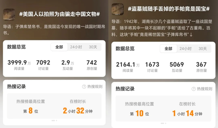 《帛书传奇》开播后,在总台央视综合频道黄金时段首播平均收视率0.73%,累计观众规模8789.8万人,相关内容全网触达人次达10.26亿,相关话题69次登上热搜热榜,话题阅读量累计3.8亿人次,节目播出首日位列晚间黄金档网民评议度第一。#美国人以拍照为由骗走中国文物#登上微博热搜榜第8位,社会榜第3位,#盗墓贼随手丢掉的手帕竟是国宝#登上微博热搜榜第10位,社会榜第9位。