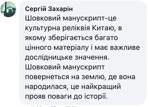 乌克兰语网友谢尔盖·扎哈琳评论:“帛书是中国的文物,上面记载着很多珍贵内容,具有重要研究价值。让帛书回到其诞生地,才是对历史最好的尊重。”
