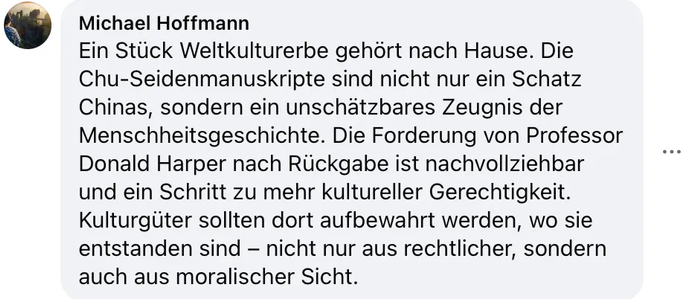 德语网友霍夫曼评论:“文物归还,是对文明的尊重。子弹库帛书不仅是中国的国宝,更是全人类的文化遗产。它流落海外近80年,早已不只是学术问题,更关乎历史公正。正如芝加哥大学教授夏德安所说,让文物回家,是迟到但必须兑现的承诺。”