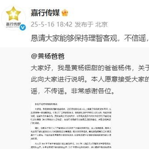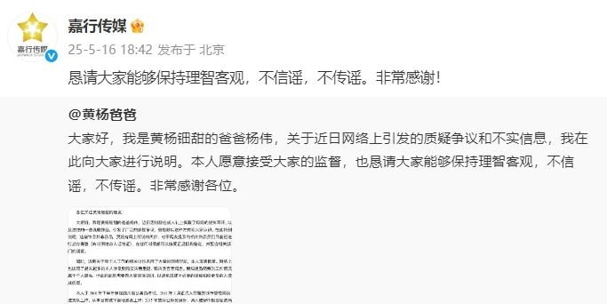 今日,嘉行传媒针对近期“黄杨钿甜爸爸 雅安公务员”事件发布声明,称该公司、黄杨钿甜女士及其父母愿意接受社会公众的合理监督。此后,黄杨钿甜的爸爸杨伟也在社交媒体上对该事件进行说明。