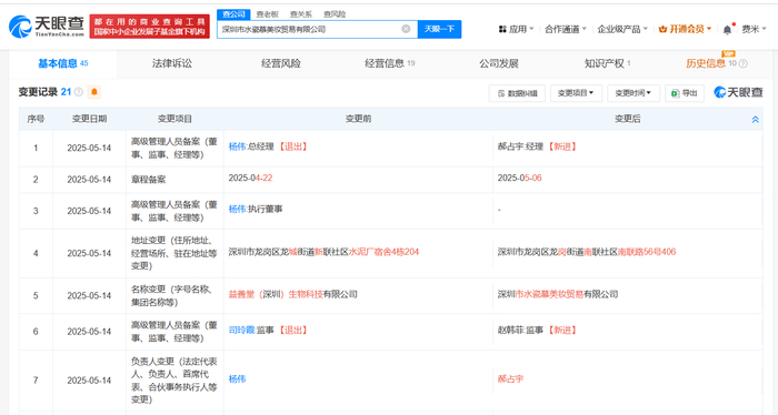 值得注意的是,5月14日,杨伟和司玲霞共同关联的益善堂(深圳)生物科技有限公司发生工商变更,该公司名称变更为深圳市水瓷慕美妆贸易有限公司,杨伟卸任法定代表人、执行董事、总经理并退出股东行列,司玲霞卸任监事。目前,司玲霞名下关联4家企业,仅1家餐饮管理店为开业状态,二人已无共同关联企业。