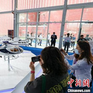 5月11日,第十一届中国国际警用装备博览会在北京首钢会展中心开幕。本届警博会为期4天,图为各式警用直升机模型吸引观众。中新社记者 贾天勇 摄