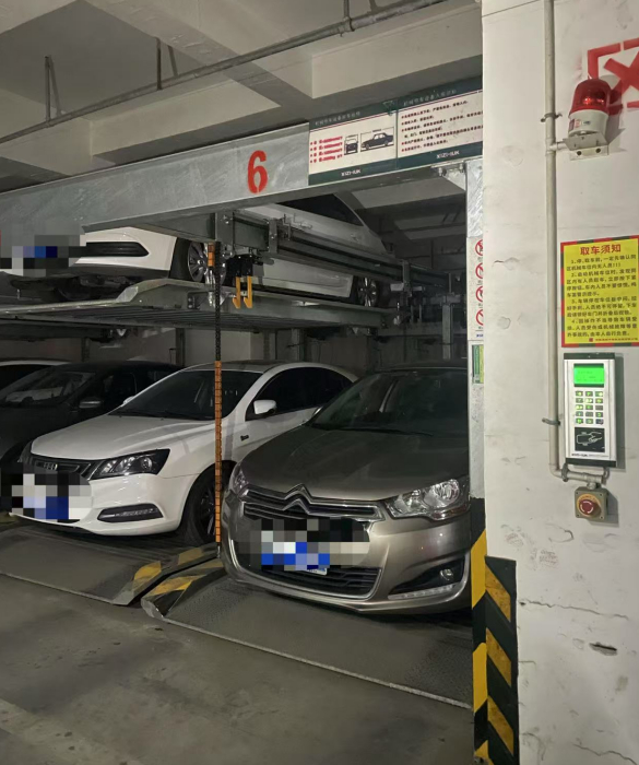 2层车位上没有车辆停放,1层车位上也只有少量汽车,控制升降的控制器同样也是断电状态。