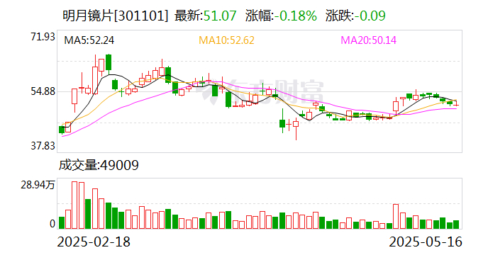 交易行情显示,截至5月16日收盘,明月镜片股价报51.07元/股,总市值102.9亿元。