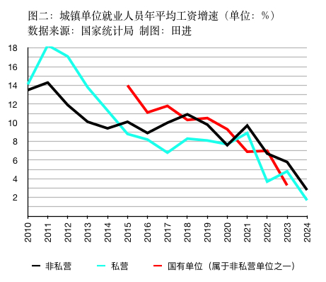 在工资差距不断扩大的背景下,近年来私营、非私营单位的工资增速整体呈现快速下滑趋势。