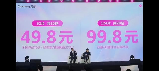 卫生巾售价在发布会现场公布,62片49.8元,124片99.8元,今晚七点发售。