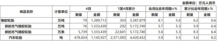 1-4月汽车轮胎出口量为257.1万吨,同比增长5.6%;出口金额为442亿元,同比增长6.2%。