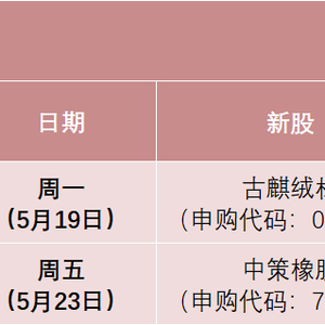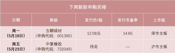 周一(5月19日)可申购深市主板新股古麒绒材,周五(5月23日)可申购沪市主板新股中策橡胶。
