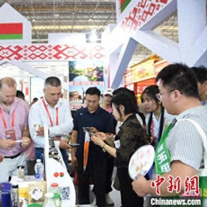 在白俄罗斯展馆,展品涵盖乳制品、果汁、巧克力、面粉、休闲食品、果蔬罐头等6大类100余个品种。