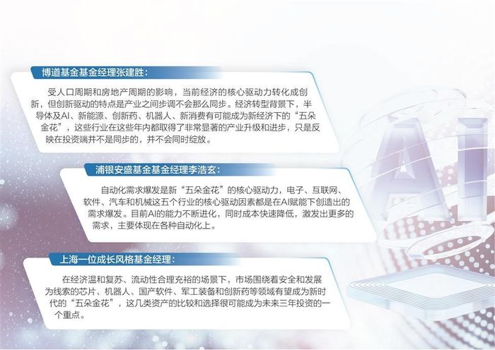 上海一位成长风格基金经理认为,在经济温和复苏、流动性合理充裕的场景下,市场围绕着安全和发展为线索的芯片、机器人、国产软件、军工装备和创新药等领域有望成为新时代的“五朵金花”,这几类资产的比较和选择很可能成为未来三年投资的一个重点。