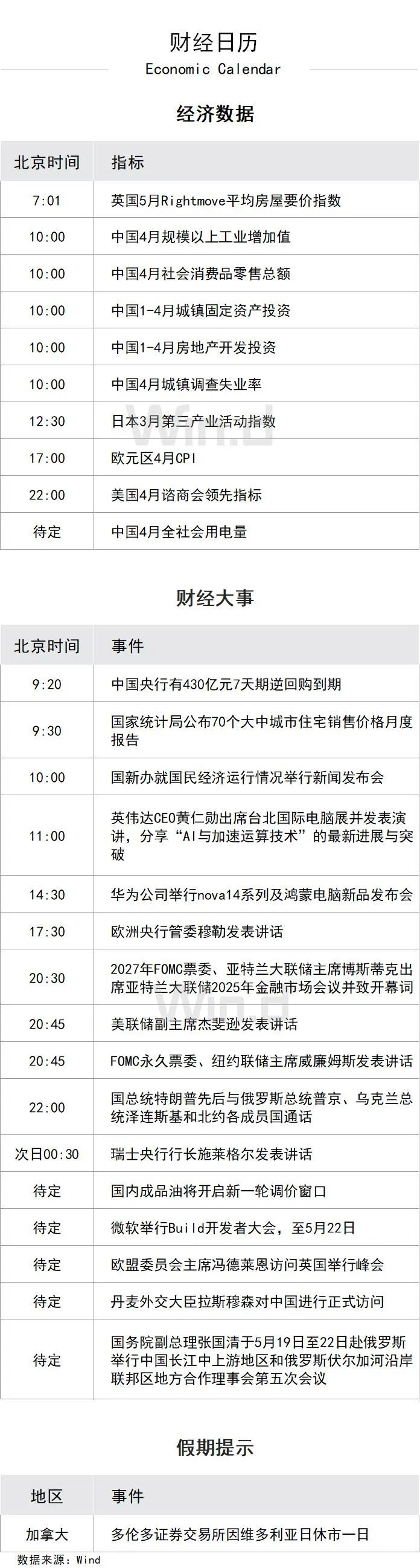 2、美国财长贝森特回应穆迪下调美国信用评级称,他不太相信穆迪,穆迪评级“落后于指标”。贝森特称,美国GDP增长速度将超过债务增长速度。贝森特计划出席5月20日至22日在加拿大举行的七国集团财长、央行行长会议。